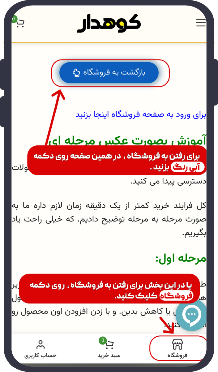 طبق تصویر شماره، از طریق دکمه آبی رنگ بالای این صفحه یا از طریق منو پایین وارد فروشگاه شوید.