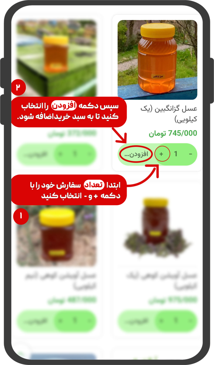 پس از ورود به فروشگاه، محصول مورد نظر را انتخاب کرده ، با دکمه های + و – تعداد سفارش خود را مشخص کنید ، و سپس روی دکمه افزودن بزنید تا به سبد خرید شما اضافه شود.