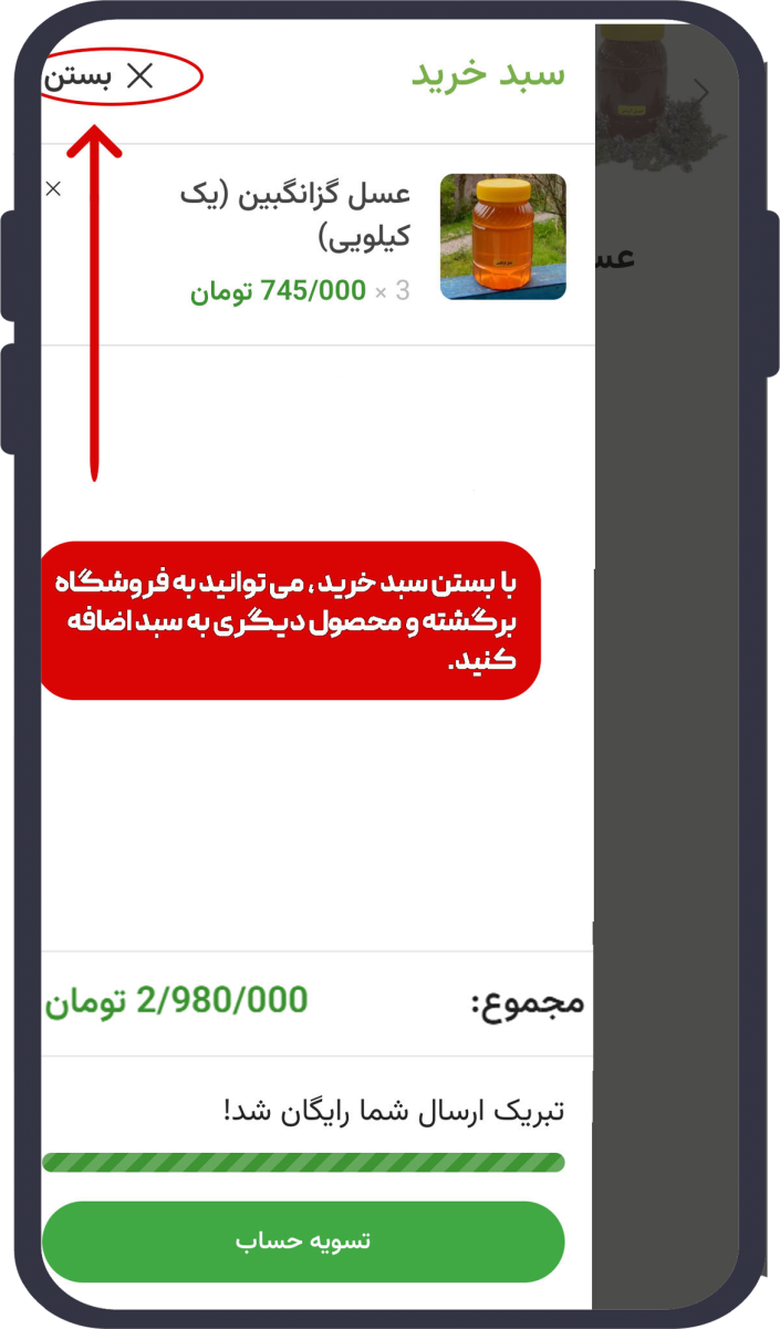 در این مرحله، محصول مورد نظر شما در سبد خرید قرار گرفته است، تعداد، قیمت هر محصول وقیمت مجموع سفارش ها محاسبه شده است. برای برگشتن به صفحه فروشگاه، طبق تصویر دکمه بستن را بزنید تا به لیست محصولات بازگردید.