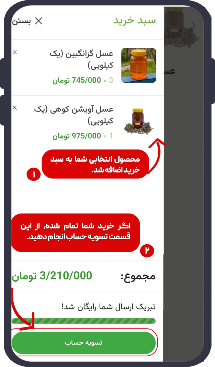 در صورتیکه سفارش هایتان را انتخاب کردید، دکمه سبز پایین صفحه ، یعنی دکمه تسویه حساب را انتخاب کنید.