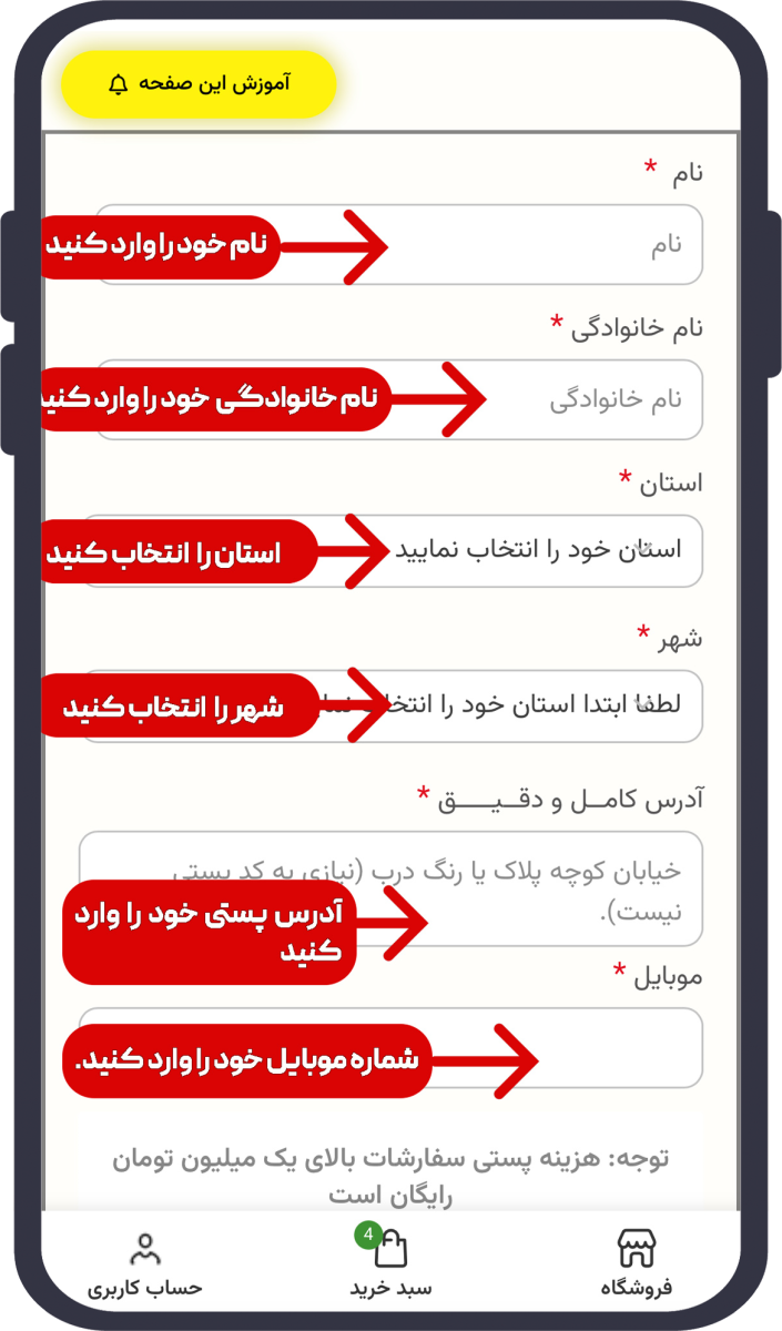 در این مرحله، طبق تصویر باید مشخصات و آدرس خود را وارد کنید. دقت داشته باشید تا آدرس پستی صحیح وارد کنید تا سفارش شما به دستتان برسد.
