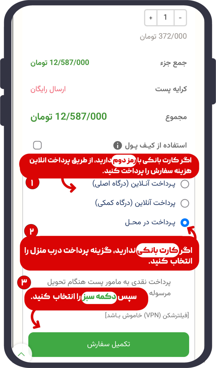 پس از انتخاب روش پرداخت، روی دکمه تکمیل سفارش بزنید.