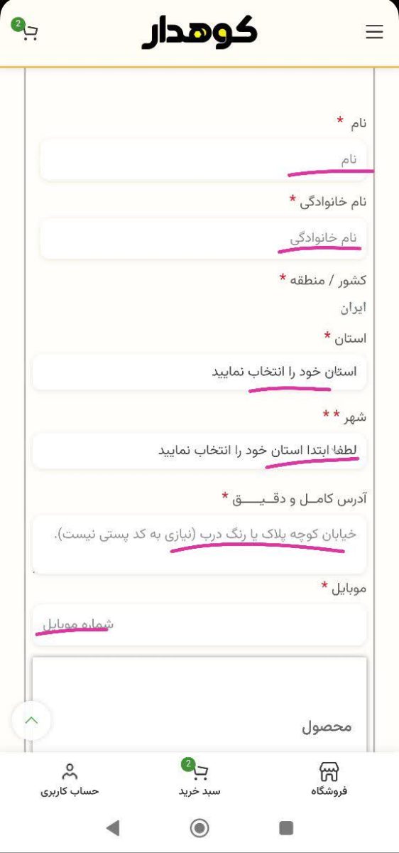 در این مرحله با وارد کردن مشخصات همانطور که در نمونه دیده می شود ابتدا نام و نام خانوادگی را وارد می کنید و سپس آدرس دقیق (به کد پستی نیاز نیست) ولی پلاک یا رنگ درب حتما وارد کنید و سپس شماره موبایل رو وارد می کنیم تا مشخصات کامل بشه.