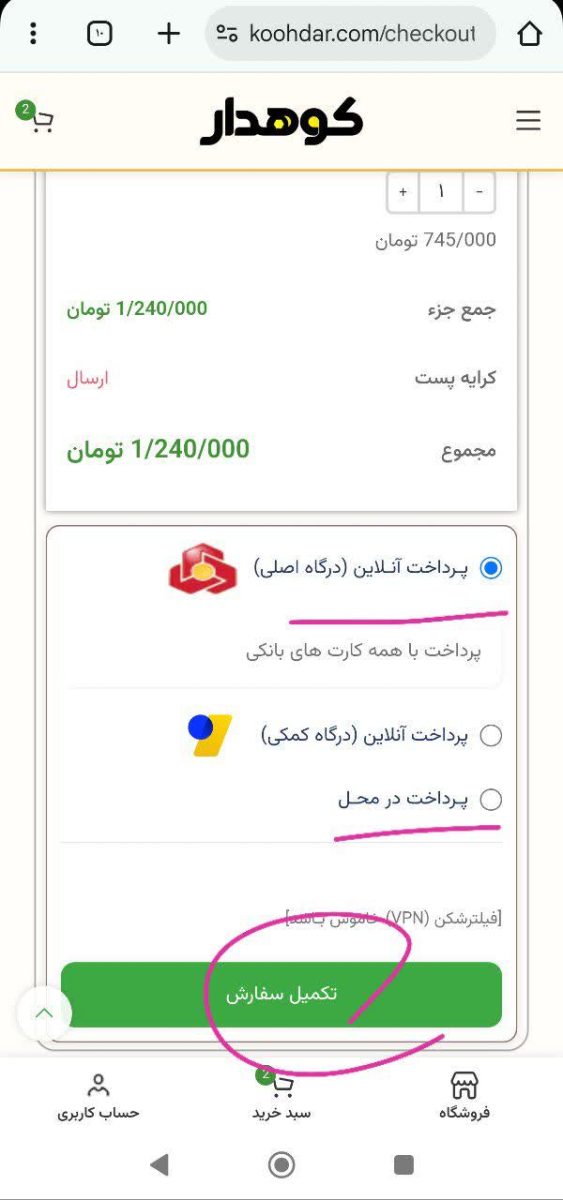 با زدن دکمه تسویه حساب در پایین کادری که باز شده به مرحله بعدی می رویم تا سفارش رو تکمیل کنیم.