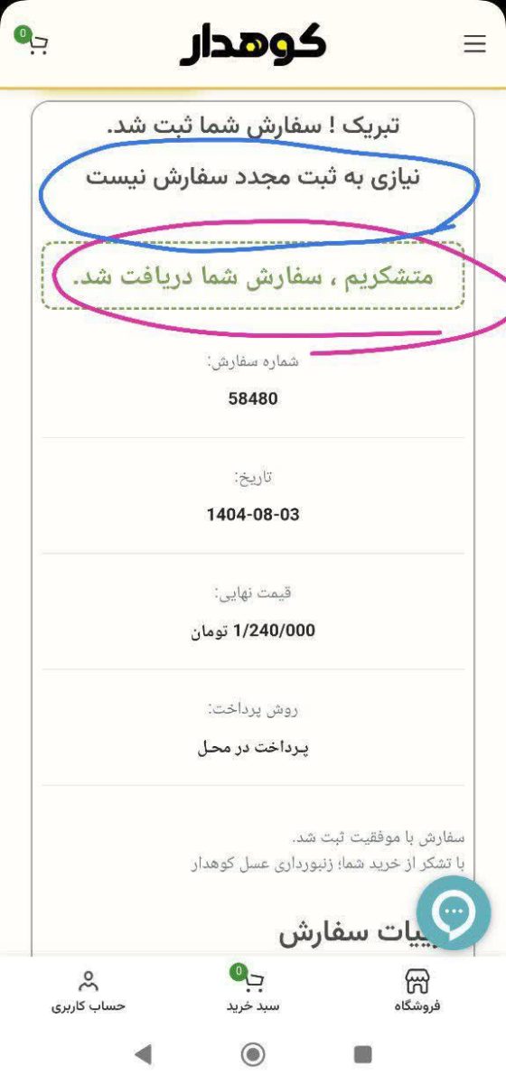 اگر این صفحه ای که پایین مشاهده می کنید یعنی سفارش شما با موفقیت ثبت شده و دیگه نیازی به ثبت مجدد ثبت سفارش ندارید در غیر اینصورت به خاطر ثبت سفارش مجدد سفارش شما با تاخیر ارسال میشه به خاطر جلوگیری از ثبت سفارش اشتباه.