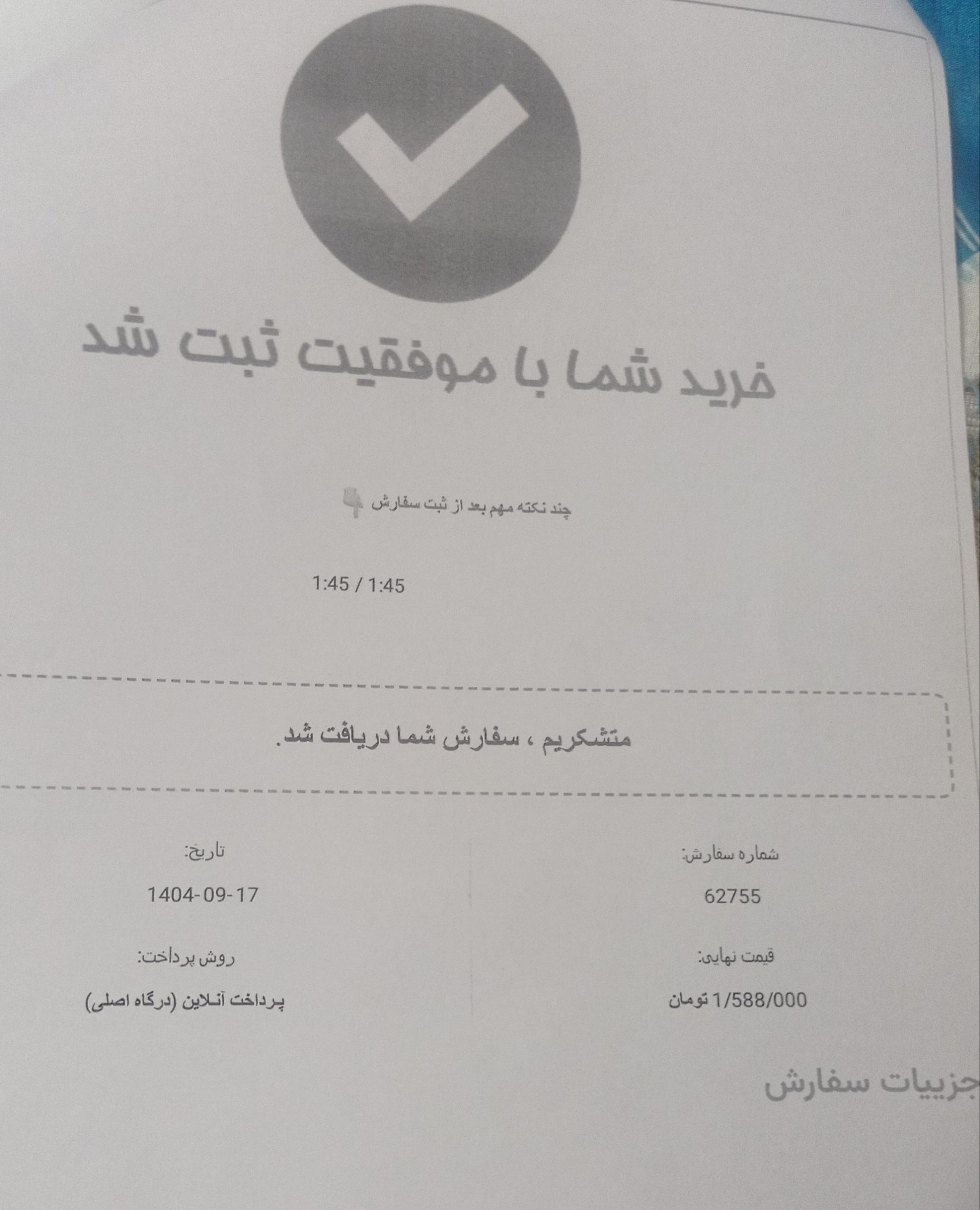 برای اطمینان از سفارشتون می تونید با شماره 04591010711 تماس بگیرید از ساعت 8:30 تا 17:30 همکارم پاسخگو هستن